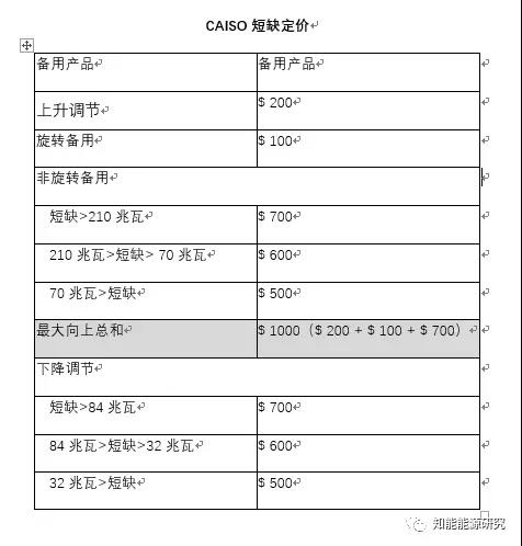 當(dāng)CAISO確定存在或?qū)⒋嬖谶\(yùn)營備用不足時(shí),將觸發(fā)短缺定價(jià)機(jī)制,并且將根據(jù)CAISO的稀缺需求曲線中的適當(dāng)值設(shè)定運(yùn)營備用的市場出清價(jià)格,詳見下表。
