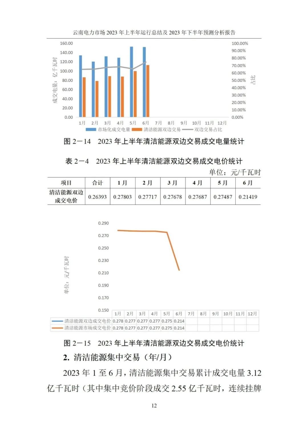 2023年上半年共成交電量819.46億千瓦時(含電網(wǎng)代理購電電量55.72億千瓦時),同比(817.55億千瓦時)增長0.23%。2023年上半年云南電力市場清潔能源交易平均成交價0.26449元/千瓦時,同比上漲了 6.8 厘/千瓦時。詳情如下: