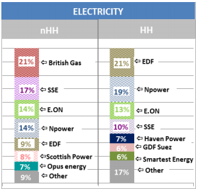 大約90%的英國居民還是那六家曾經(jīng)區(qū)域壟斷公司的客戶,當(dāng)然“蛋糕的分配”出現(xiàn)了變化。下圖是ofgem對于天然氣和電力客戶簽約情況的一個描述(來源[3])。