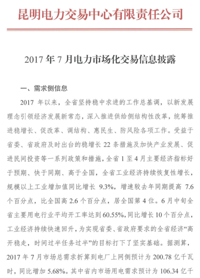 6月20日,昆明電力交易中心發(fā)布了《2017年7月電力市場(chǎng)化交易信息披露》,披露中稱,據(jù)測(cè)算,2017年7月市場(chǎng)總需求折算到電廠上網(wǎng)側(cè)預(yù)計(jì)為200 78億千瓦時(shí),同比增加5 68%。其中省內(nèi)市場(chǎng)用電需求預(yù)計(jì)為106 34億千瓦