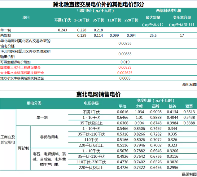 冀北的用戶側(cè)電價(jià)計(jì)算方式跟天津的一樣,按照以下圖中對(duì)應(yīng)的價(jià)格計(jì)算同樣能算出冀北區(qū)內(nèi)和區(qū)外交易的最終電價(jià)。為方便大家對(duì)比晶見(jiàn)工作室還把冀北的銷售電價(jià)整理最下面的一張圖哦。