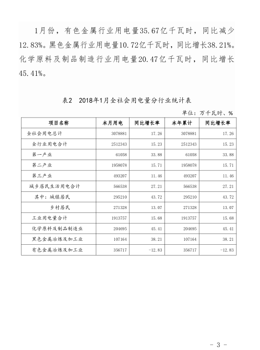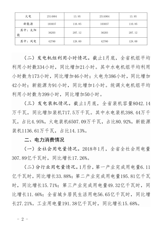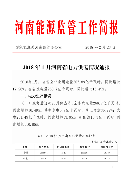 國家能源局河南監(jiān)管辦發(fā)布了《2018年1月河南省電力供需情況通報》,2018年1月,全省全社會用電量307.89億千瓦時,同比增長17。26%。全省發(fā)電量268.7億千瓦時,同比增長16.49%。