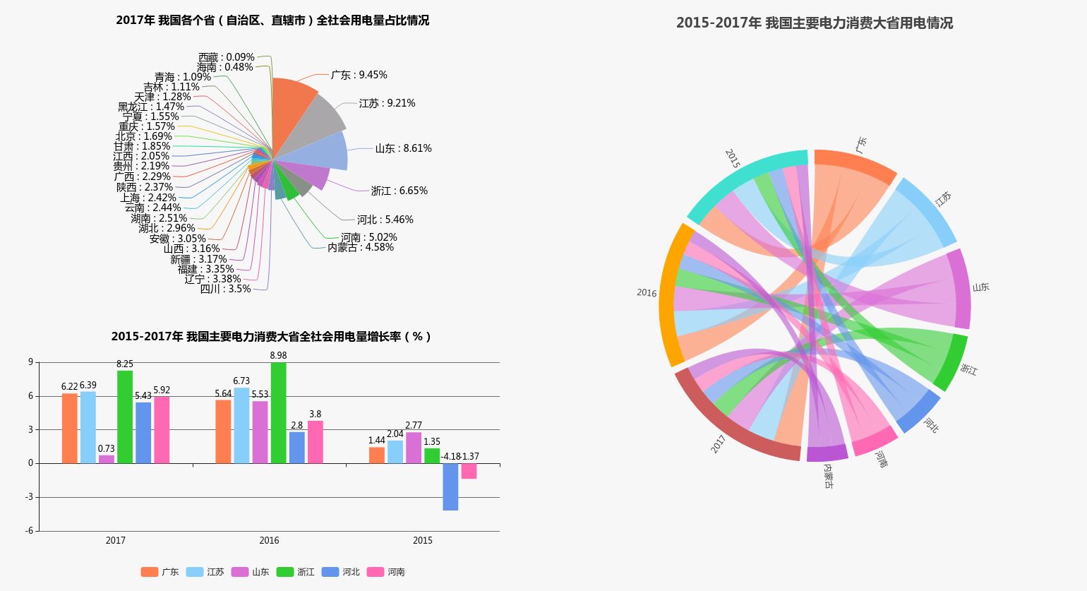 2017年,東部、南方地區(qū)依然是我國(guó)主要的經(jīng)濟(jì)區(qū),廣東、江蘇、山東、浙江GDP超過(guò)50000億元4個(gè)經(jīng)濟(jì)大省,同時(shí)全社會(huì)用電量也居于全國(guó)前四位,四個(gè)省份綜合占我國(guó)全社會(huì)用電量的33.9%,與去年同期相比下降了0.1個(gè)百分點(diǎn)。