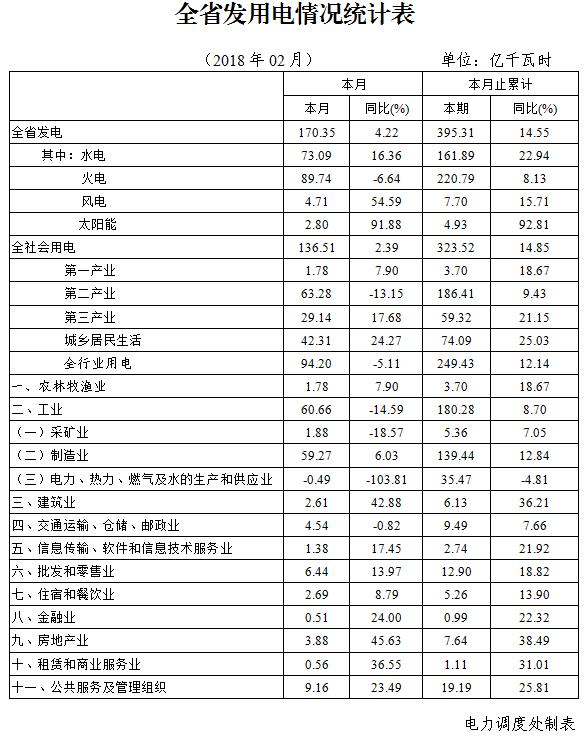 元至二月,全省用電快速增長,發(fā)供電生產(chǎn)秩序平穩(wěn),電力供應(yīng)保障有力,總體情況良好。全省累計(jì)發(fā)電395.31億千瓦時,增長14.55%;全社會累計(jì)用電323.52億千瓦時,增長14.85%,其中工業(yè)用電180.28億千瓦時,增長8.70%。