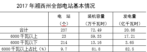 2017年底,全州共有大小電站237座,全社會(huì)電力生產(chǎn)量為20.86億千瓦時(shí),同比增長(zhǎng)2.2%。全州電站裝機(jī)容量為72.49萬千瓦,同比增長(zhǎng)6.3%;裝機(jī)容量在6000千瓦以上的電站有23座,占比為9.7%;6000千瓦以下的電站215座,占比為90.3%。