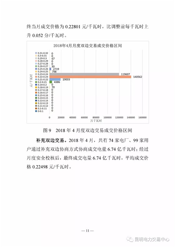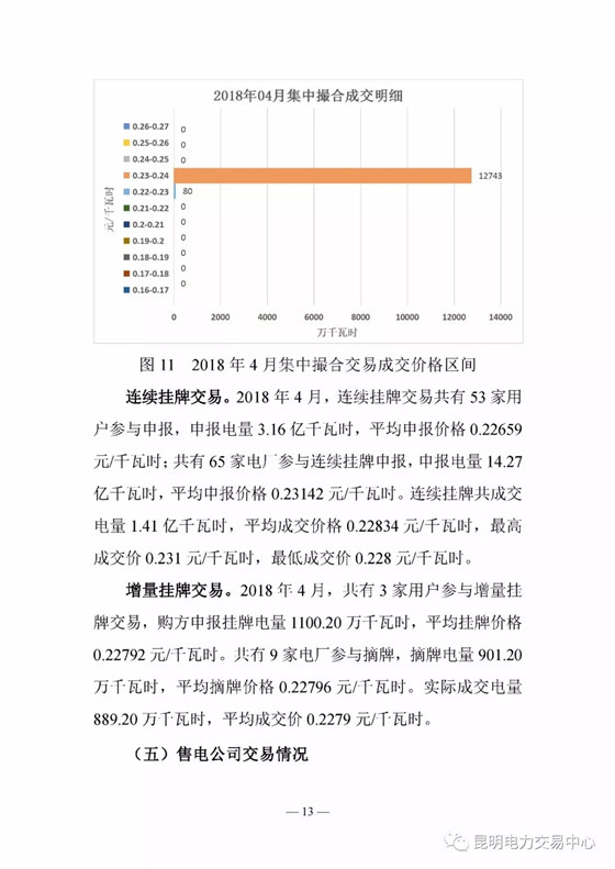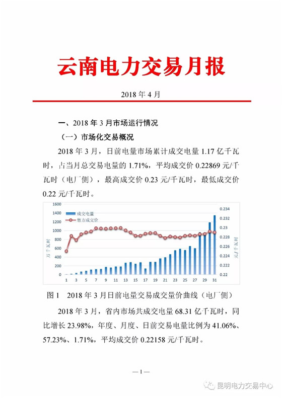 昆明電力交易中心日前發(fā)布了《云南電力交易月報(2018年4月)》,2018年3月,日前電量累計成交電量1.17億千瓦時,占當月總交易電量的1.71%,平均成交價0.22869元/千瓦時(電廠側),最高成交價0.23元/千瓦時,最低成交價0.22元/千瓦時。