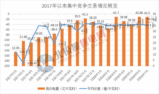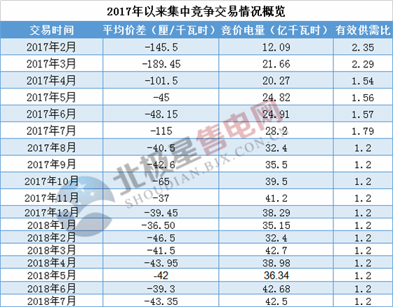 值得注意的是,本月價(jià)差再度持續(xù)走低,平均價(jià)差僅為-43.35厘/千瓦時(shí),與2018年4月價(jià)差持平,成交量與上月相比基本持平。7月份市場用電總需求電量為146.5億千瓦時(shí),扣除年度合同電量104億千瓦時(shí)后,集中競爭電量需求為42.5億千瓦時(shí),7月集中競爭電量需求扣除必開頂峰電量19.9億,已申請強(qiáng)制成交電量1.9億千瓦時(shí)后,有效競爭電量需求為20.7億千瓦時(shí)。