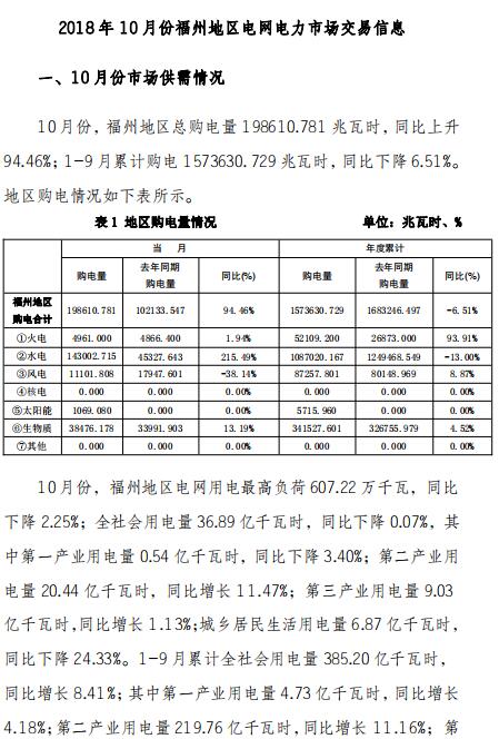 福建福州2018年10月電力市場交易:總購電量同比上升94.46%