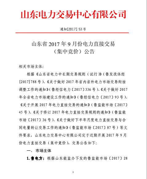 山東發(fā)布9月份電力直接交易(集中競價)公告