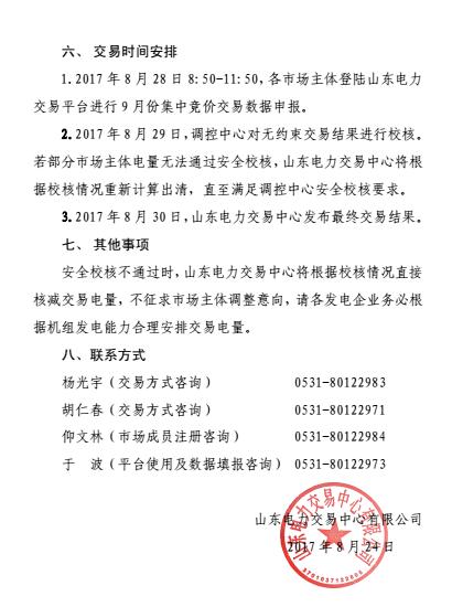 從山東電力交易中心獲悉,山東電力交易中心2日發(fā)布了關(guān)于2017年9月份電力直接交易(集中競價)公告。交易采取集中競價交易方式,2017年8月28日8:50-11:50,各市場主體登錄山東電力交易平臺進(jìn)行9月份集中競價交易