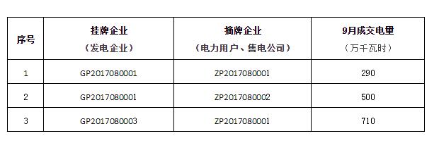 關(guān)于2017年9月掛牌交易(發(fā)電企業(yè)掛牌)成交情況的公告