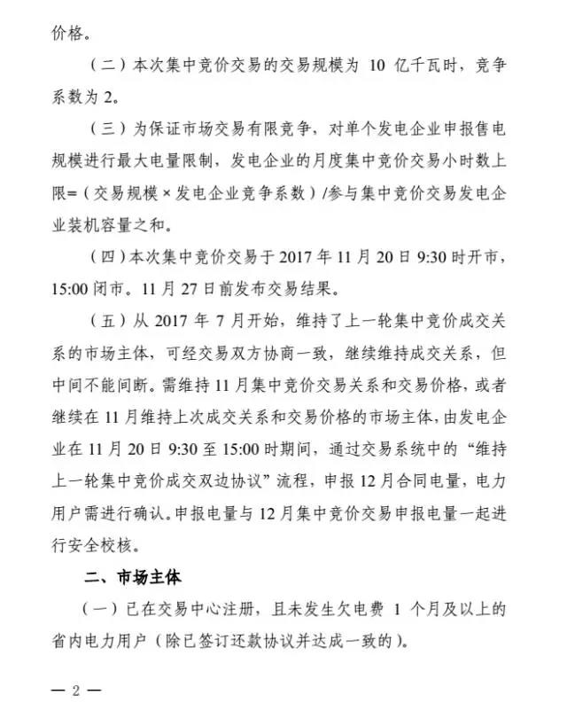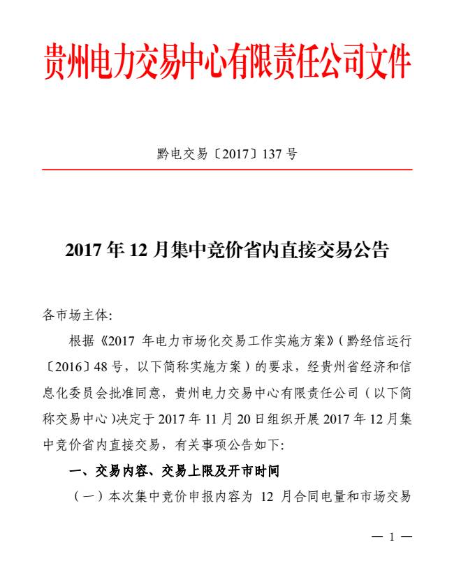 11月16日,貴州電力交易中心發(fā)布了《2017年12月集中競(jìng)價(jià)省內(nèi)直接交易公告》,公告稱將于11月20日組織開(kāi)展12月集中競(jìng)價(jià)省內(nèi)直接交易,交易規(guī)模為10億千瓦時(shí),競(jìng)爭(zhēng)系數(shù)為2。