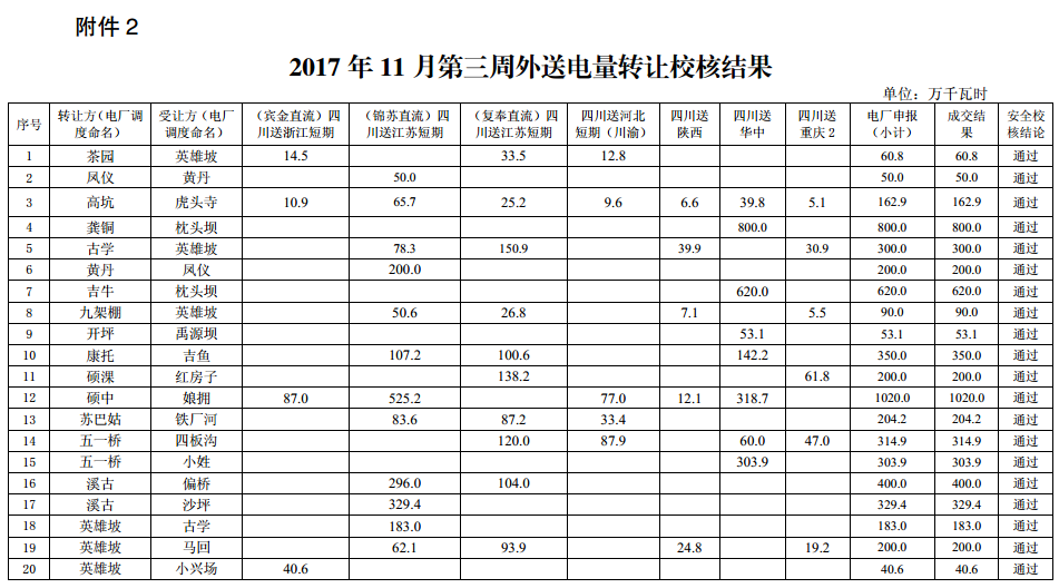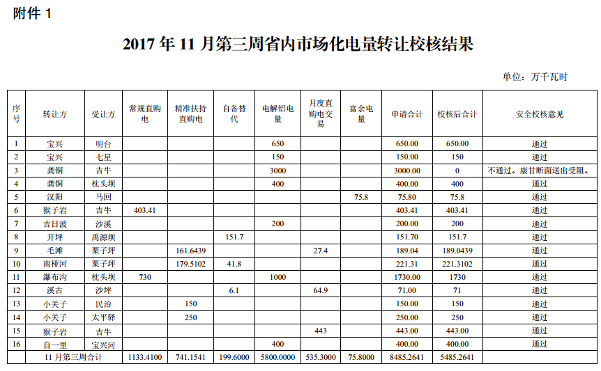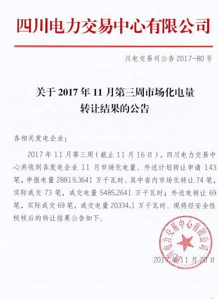 11月20日,四川電力交易中心發(fā)布了《2017年11月第三周市場化電量轉(zhuǎn)讓結(jié)果的公告》,公告稱共收到各發(fā)電企業(yè)11月市場化電量、外送計劃轉(zhuǎn)讓申請143筆,申報電量28819 3641萬千瓦時。其中省內(nèi)市場化轉(zhuǎn)讓74筆,實際成