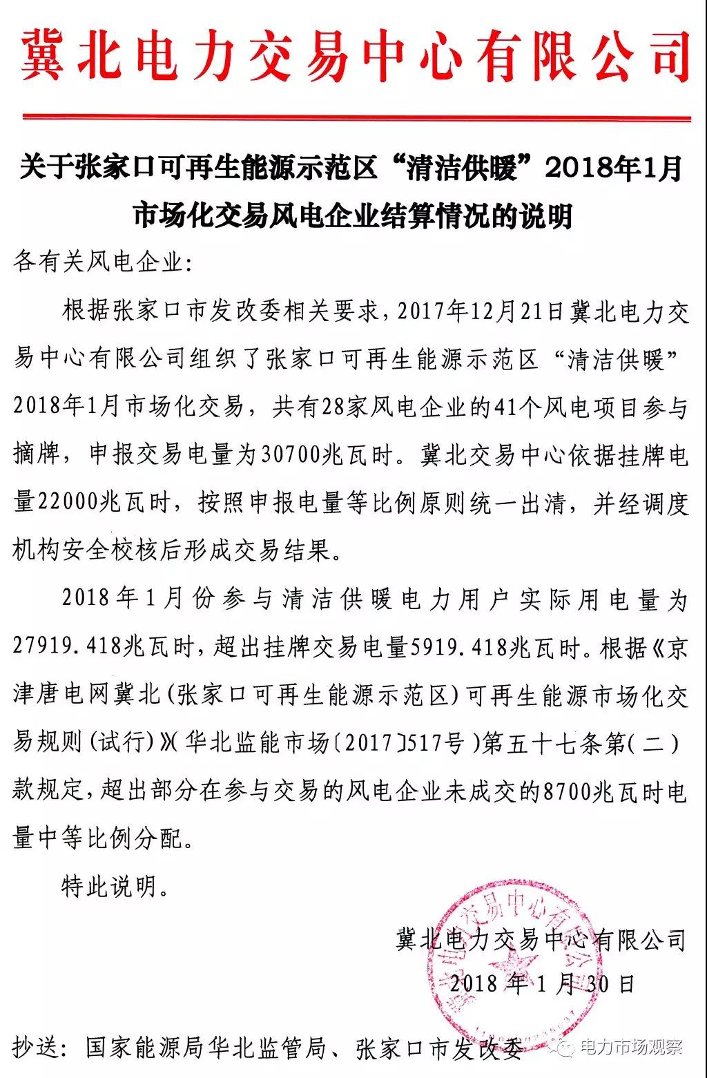1月30日,冀北電力交易中心發(fā)布《關(guān)于張家口可再生能源示范區(qū)“清潔供暖”2018年1月市場化交易風(fēng)電企業(yè)結(jié)算情況的說明》。