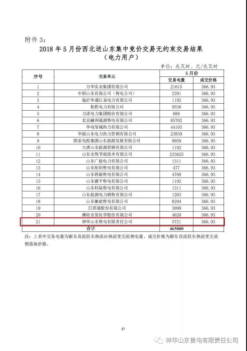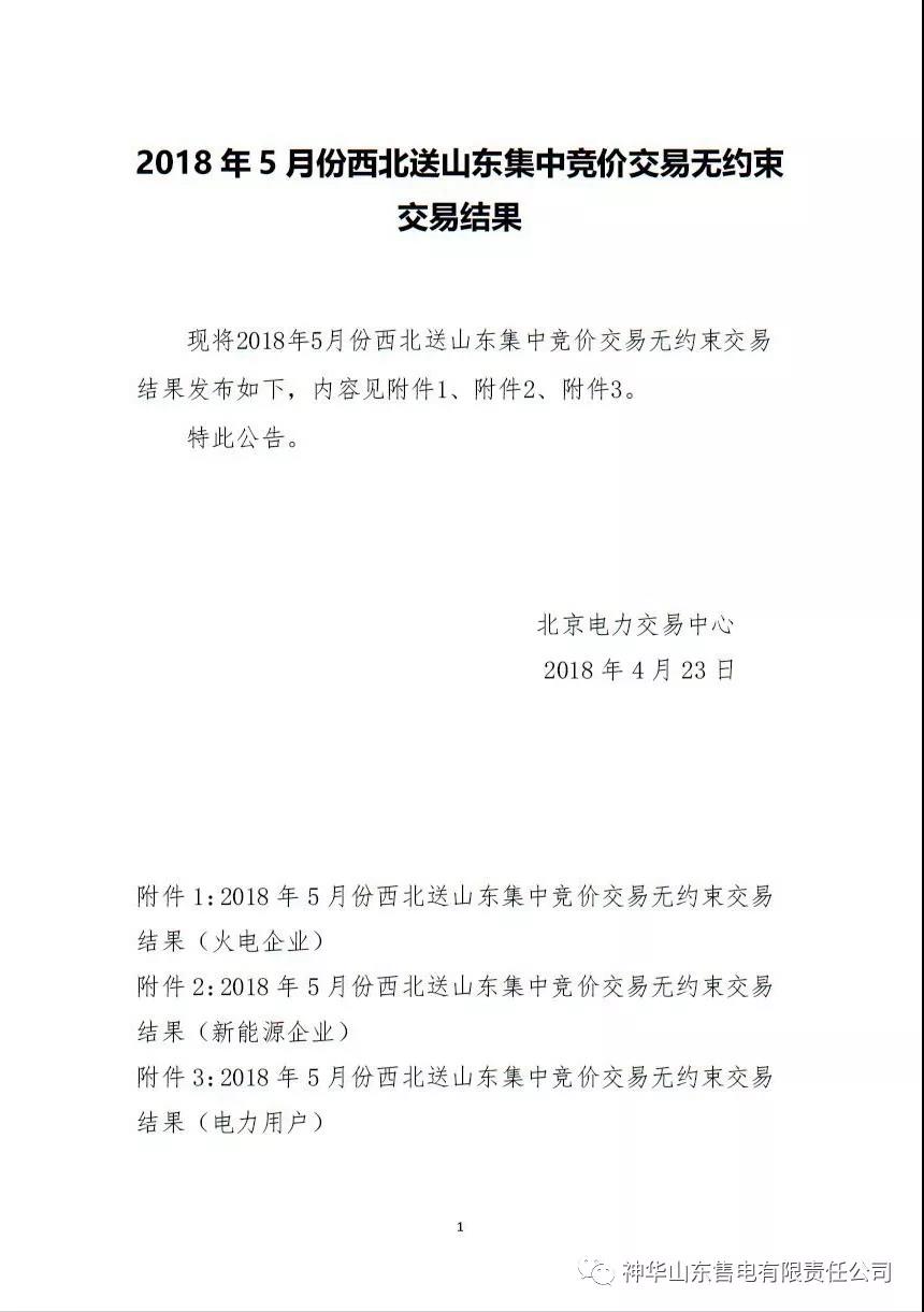 2018年5月份西北送山東集中競(jìng)價(jià)交易無(wú)約束交易結(jié)果