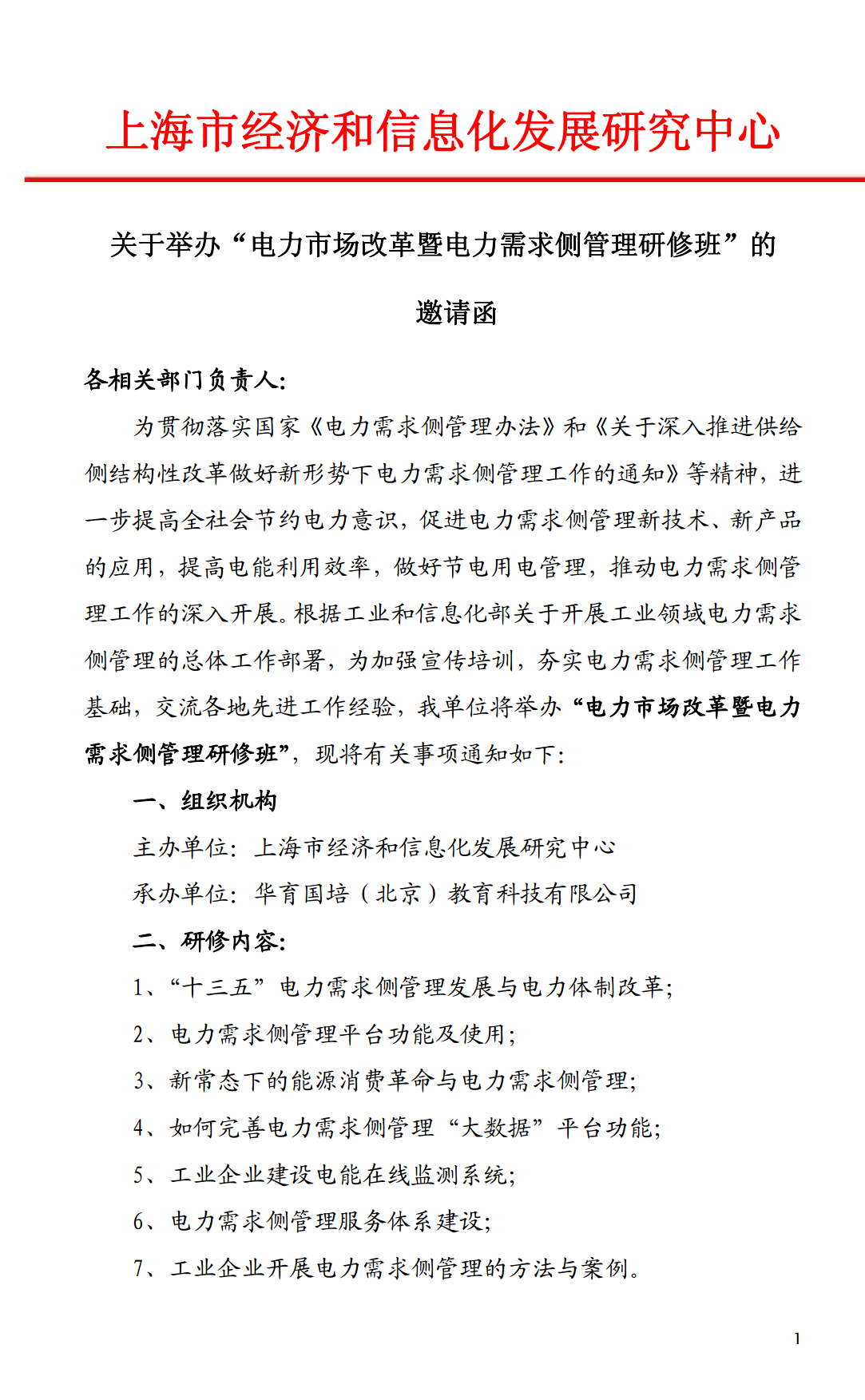 關(guān)于舉辦電力市場(chǎng)改革暨電力需求側(cè)管理研修班 的邀請(qǐng)函各相關(guān)部門負(fù)責(zé)人:為貫徹落實(shí)國(guó)家《電力需求側(cè)管理辦法》 和《關(guān)于深入推進(jìn)供給側(cè)
