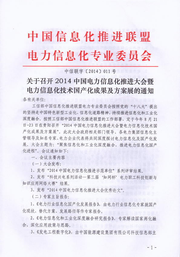 關(guān)于召開(kāi)2014中國(guó)電力信息化推進(jìn)大會(huì)暨電力信息化技術(shù)國(guó)產(chǎn)化成果及方案展的通知