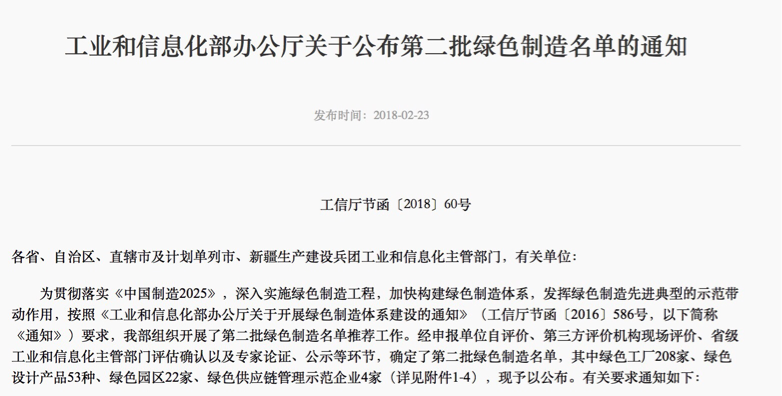 為貫徹落實(shí)《中國制造2025》,深入實(shí)施綠色制造工程,加快構(gòu)建綠色制造體系,發(fā)揮綠色制造先進(jìn)典型的示范帶動(dòng)作用,按照《工業(yè)和信息化部辦公廳關(guān)于開展綠色制造體系建設(shè)的通知》要求,工信部組織開展了第二批綠色制造名單推薦工作。