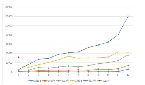 下面分析 2013年到2017年(共4年)新能源乘用車月銷售走勢。2013、2014年基本處于試銷期,到2017年12月上升到12萬輛/月的水平。