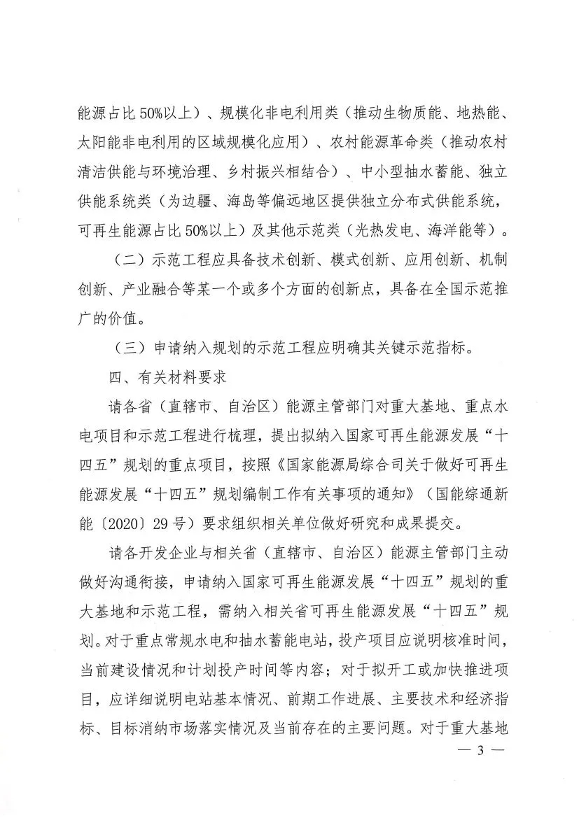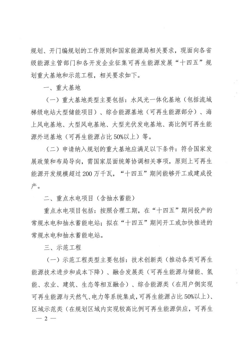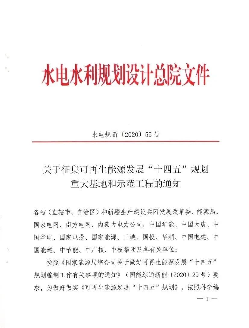 水電水利規(guī)劃總院近日發(fā)布了《關于征集可再生能源發(fā)展 "十四五 "規(guī)劃重大基地和示范工程的通知》。