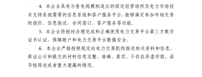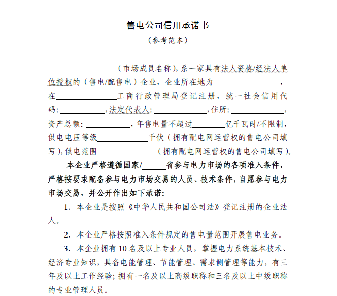 第九條 “一承諾”。售電公司辦理注冊時,應(yīng)按固定格式簽署信用承諾書,并向電力交易機構(gòu)提交以下資料:營業(yè)執(zhí)照、法人代表、資產(chǎn)證明、從業(yè)人員、經(jīng)營場所和設(shè)備等基本信息和銀行賬戶、售電范圍等交易信息。擁有配電網(wǎng)運營權(quán)的售電公司還需提供配電網(wǎng)電壓等級、供電范圍、電力業(yè)務(wù)許可證(供電類)等相關(guān)資料。