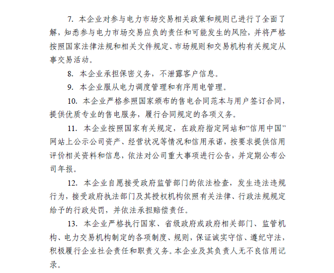 (八)承諾履行電力社會普遍服務(wù)、保底供電服務(wù)義務(wù)。