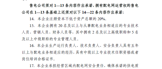 (三)增加與從事配電業(yè)務(wù)相適應(yīng)的專業(yè)技術(shù)人員、營銷人員、財務(wù)人員等,不少于20人,其中至少擁有兩名高級職稱和五名中級職稱的專業(yè)管理人員。