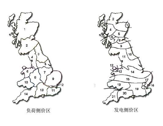 為保證發(fā)電市場競爭的合理性、公平性,不同的國家采用不同的輸配電價定價機制。例如英國采用點費率法分區(qū)輸電定價,向發(fā)電和負荷側(cè)同時收取輸電費用。(下圖是負荷價區(qū)和發(fā)電價區(qū)的劃分圖)