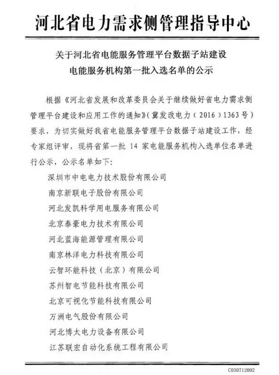 河北省電能服務(wù)管理平臺公示第一批電能服務(wù)機(jī)構(gòu)入選名單