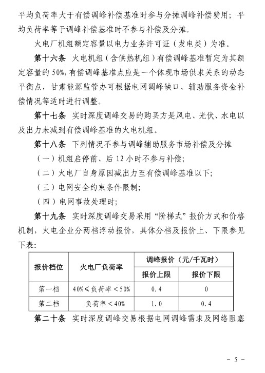 《甘肅省電力輔助服務(wù)市場運(yùn)營規(guī)則(試行)》 單機(jī)容量100MW及以上的燃煤、燃?xì)獾然痣姍C(jī)組參與調(diào)峰