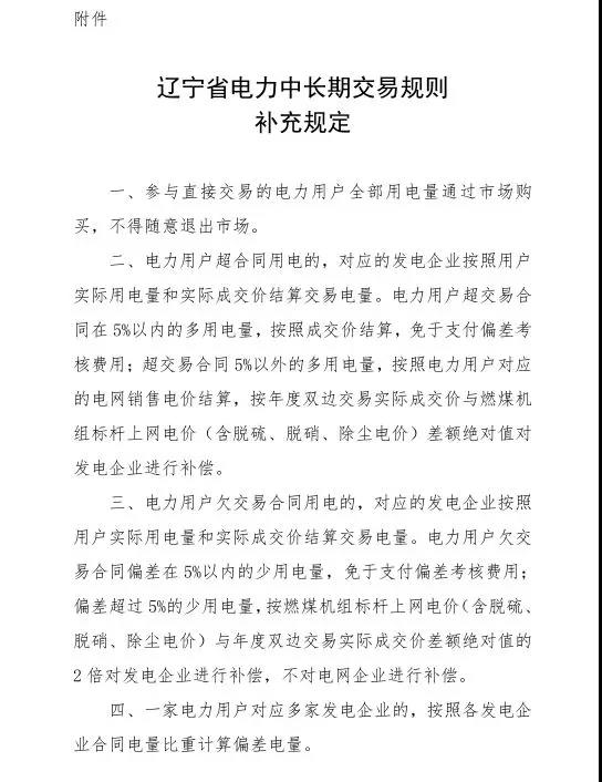 在此前7月5日發(fā)布的《遼寧省電力中長(zhǎng)期交易規(guī)則(暫行)》中規(guī)定的偏差考核標(biāo)準(zhǔn)為,電力用戶超合同用電的,超用部分按國家核定的目錄電價(jià)向電網(wǎng)企業(yè)購買,免于支付偏差考核費(fèi)用。若發(fā)生欠交易合同用電,對(duì)應(yīng)的發(fā)電企業(yè)按照用戶實(shí)際用電量結(jié)算交易電量;用戶欠交易合同偏差在2%以內(nèi)的少用電量,免于支付偏差考核費(fèi)用;偏差超過2%的少用電量,按火電環(huán)保標(biāo)桿電價(jià)的20%對(duì)發(fā)電企業(yè)進(jìn)行補(bǔ)償,按國家核定的輸配電價(jià)的10%對(duì)電網(wǎng)企業(yè)進(jìn)行補(bǔ)償。