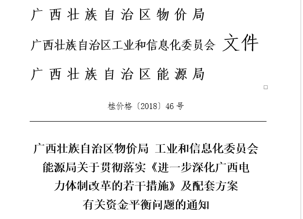 根據(jù)《廣西壯族自治區(qū)人民政府關(guān)于印發(fā)進一步深化廣西電力體制改革若干措施的通知》(桂政發(fā)〔2018〕18號)、《廣西壯族自治區(qū)人民政府辦公廳關(guān)于印發(fā)廣西水電與火(核)電發(fā)電權(quán)交易方案的通知》(桂政辦發(fā)〔2018〕21號)及《廣西壯族自治區(qū)人民政府辦公廳關(guān)于印發(fā)廣西工業(yè)園區(qū)和現(xiàn)代服務(wù)業(yè)電力市場交易方案的通知》(桂政辦發(fā)〔2018〕22號)精神,綜合考慮近兩年水電棄水與火電經(jīng)營困難的矛盾、低電壓等級電力用戶參加市場化交易遇到的瓶頸問題等,現(xiàn)將相關(guān)資金平衡問題通知如下: