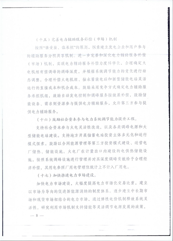 按照“誰受益、誰承擔(dān)”的原則,建立電力輔助服務(wù)市場(chǎng)機(jī)制,充分調(diào)動(dòng)發(fā)電企業(yè)提供電力輔助服務(wù)的積極性,實(shí)現(xiàn)電力輔助服務(wù)補(bǔ)償力度科學(xué)化。鼓勵(lì)采用競(jìng)爭(zhēng)方式確定電力輔助服務(wù)承擔(dān)方,鼓勵(lì)自動(dòng)發(fā)電控制和調(diào)峰服務(wù)按效果補(bǔ)償,鼓勵(lì)儲(chǔ)能設(shè)備、需求側(cè)資源,第三方參與提供電力輔助服務(wù)。逐步將地市調(diào)度機(jī)構(gòu)調(diào)度的發(fā)電機(jī)組納入電力輔助服務(wù)管理范圍。推進(jìn)國(guó)家指令性計(jì)劃,地方政府協(xié)議跨省跨區(qū)電能交易,市場(chǎng)化跨省跨區(qū)電能交易參與跨省跨區(qū)電力輔助服務(wù)補(bǔ)償。探索電力中長(zhǎng)期交易涉及的電力用戶參與電力輔助服務(wù)分擔(dān)共享機(jī)制。