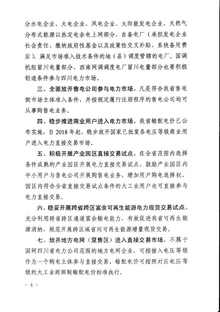 四川省經(jīng)信委、四川省發(fā)改委、國(guó)家能源局四川監(jiān)管辦、四川省能源局日前聯(lián)合下發(fā)了《關(guān)于進(jìn)一步推進(jìn)我省電力直接交易市場(chǎng)化的指導(dǎo)意見》。意見中稱,將規(guī)范完善直購(gòu)電的相關(guān)扶持政策,擴(kuò)大發(fā)電企業(yè)參與電力市場(chǎng)范圍,全面放開售電公司參與電力市場(chǎng),穩(wěn)步推進(jìn)進(jìn)商業(yè)用戶進(jìn)入電力市場(chǎng),積極開展產(chǎn)業(yè)園區(qū)直接交易試點(diǎn),穩(wěn)妥開展跨省跨區(qū)富余可再生能源電力現(xiàn)貨交易試點(diǎn),放開地方電網(wǎng)(躉售區(qū))進(jìn)入直接交易市場(chǎng),有序推進(jìn)其他特殊行業(yè)企業(yè)完全電力市場(chǎng)化。詳情如下:
