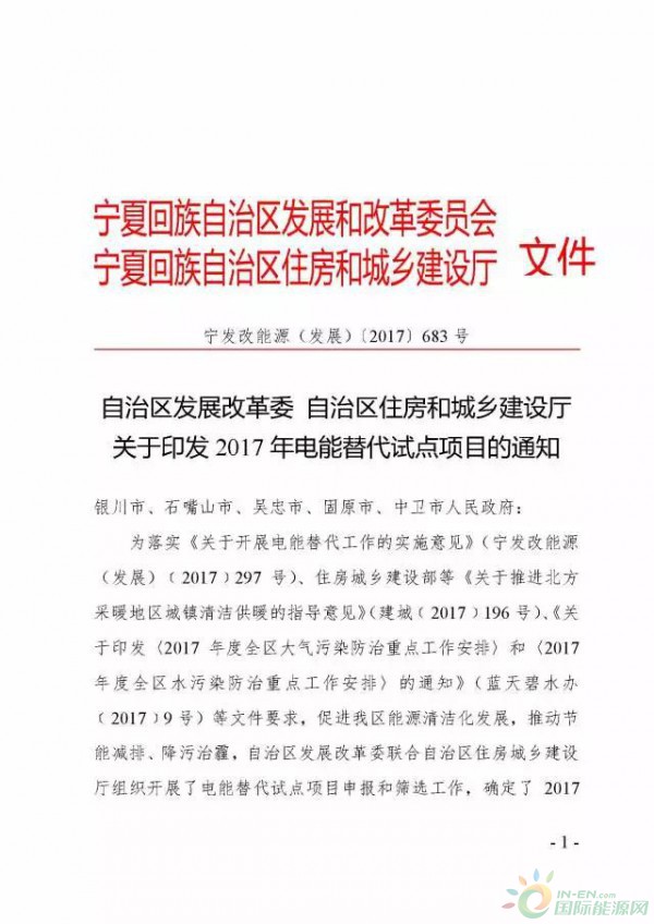 寧夏回族自治區(qū)發(fā)改委、住建部聯(lián)合發(fā)布關(guān)于《印發(fā)2017年電能替代試點項目的通知》