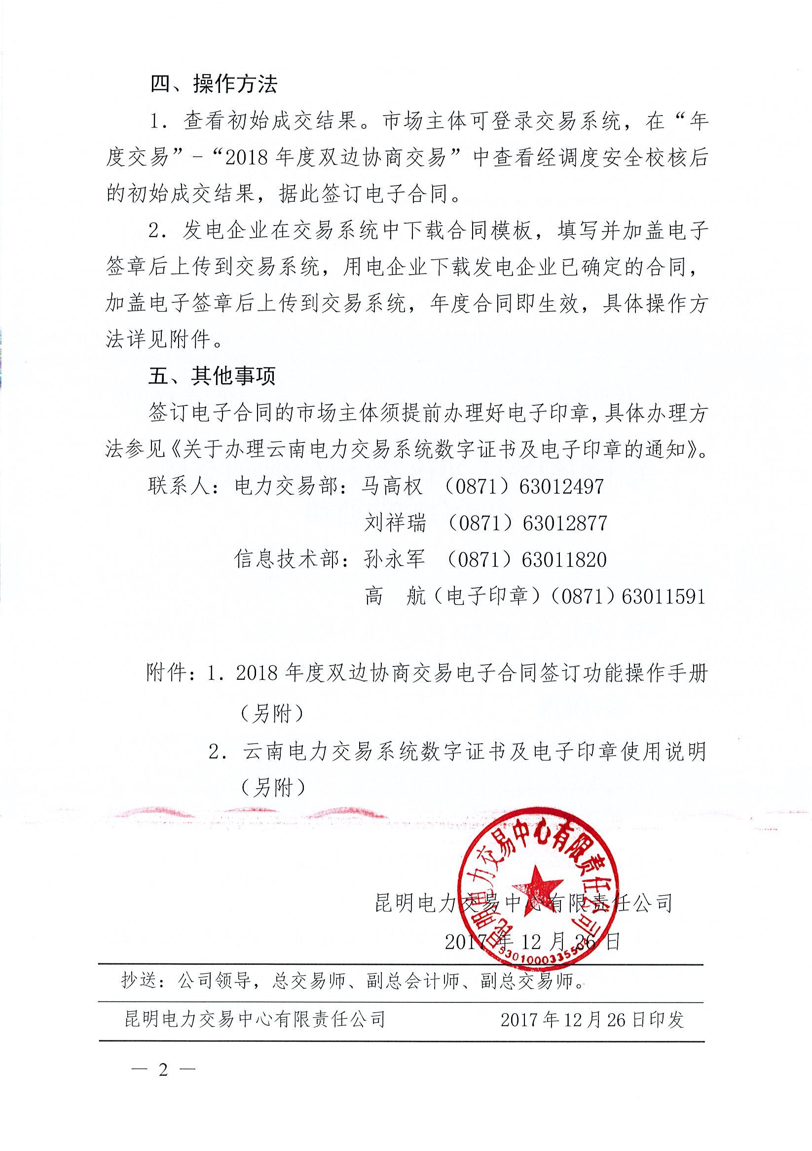 2017年12月26日,昆明電力交易中心發(fā)文《關(guān)于組織簽訂2018年度雙邊協(xié)商交易電子合同的通知》,通知各方市場主體簽訂電子合同。