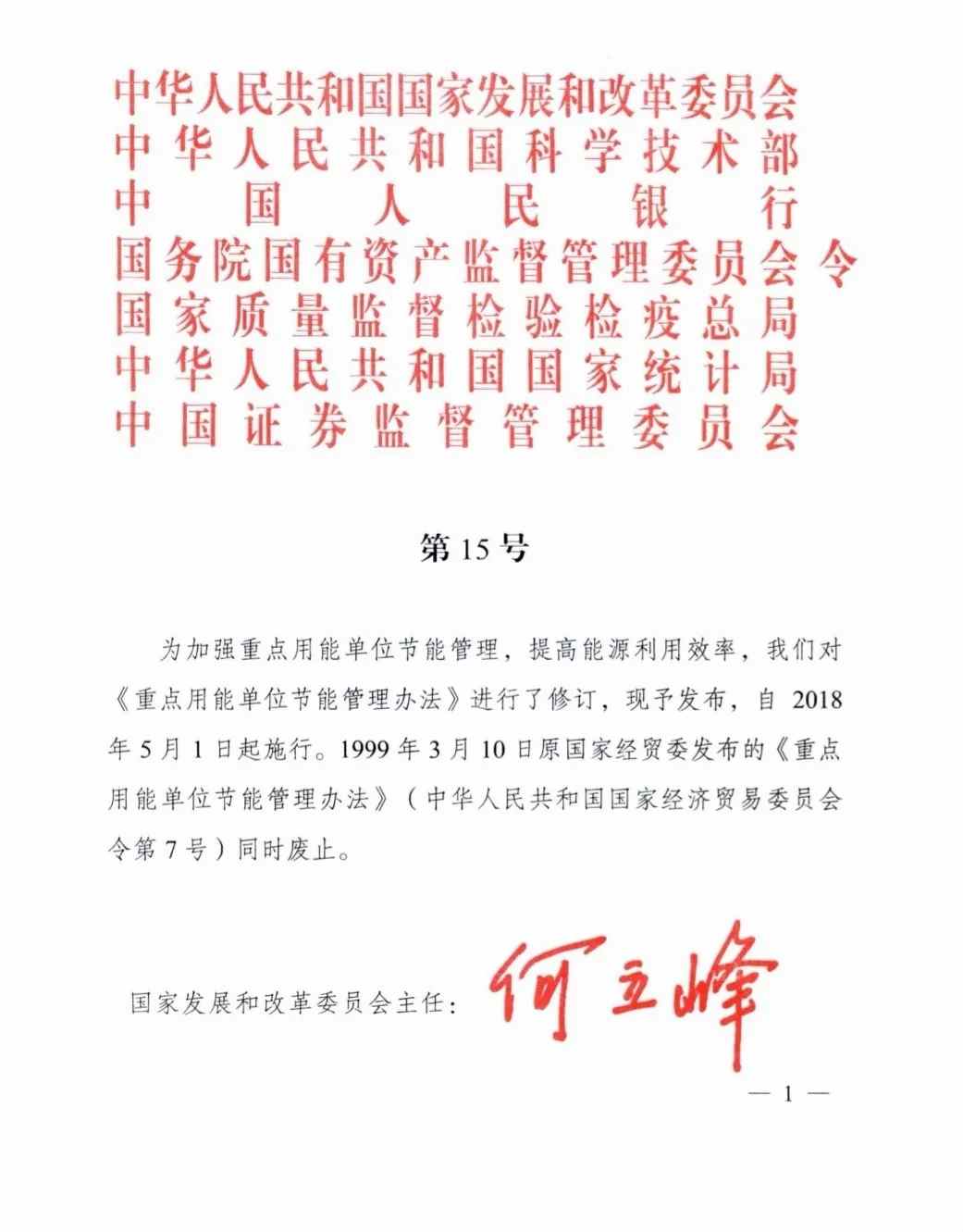 為加強(qiáng)重點(diǎn)用能單位節(jié)能管理,提高能源利用效率,控制能源消費(fèi)總量,促進(jìn)生態(tài)文明建設(shè),國家發(fā)改委、科技部、中國人民銀行、國務(wù)院國有資產(chǎn)監(jiān)督管理委員會、國家質(zhì)檢總局、國家統(tǒng)計(jì)局、中國證券監(jiān)督管理委員會日前聯(lián)合修訂發(fā)布了《重點(diǎn)用能單位節(jié)能管理辦法》(以下簡稱《辦法》)。該辦法自2018年5月1日起開始施行。1999年3月10日原國家經(jīng)貿(mào)委發(fā)布的《重點(diǎn)用能單位節(jié)能管理辦法》同時廢止。