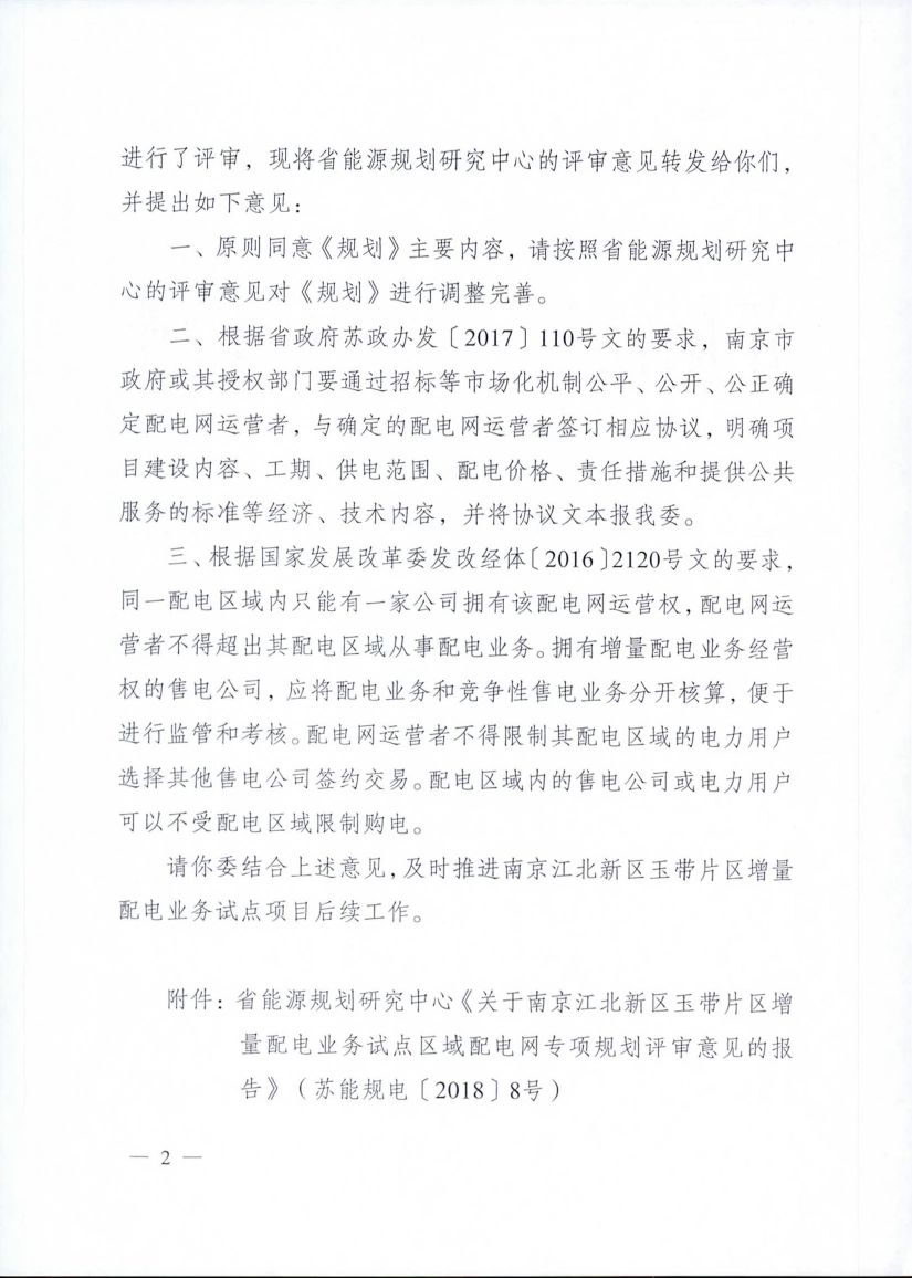 江蘇省發(fā)展改革委日前發(fā)布了《關于南京江北新區(qū)玉帶片區(qū)增量配電業(yè)務試點區(qū)域配電網專項規(guī)劃的意見》。原則上同意《南京江北新區(qū)玉帶片區(qū)增量配電業(yè)務試點區(qū)域配電網專項規(guī)劃》主要內容,明確了增量配電網的區(qū)域范圍等。