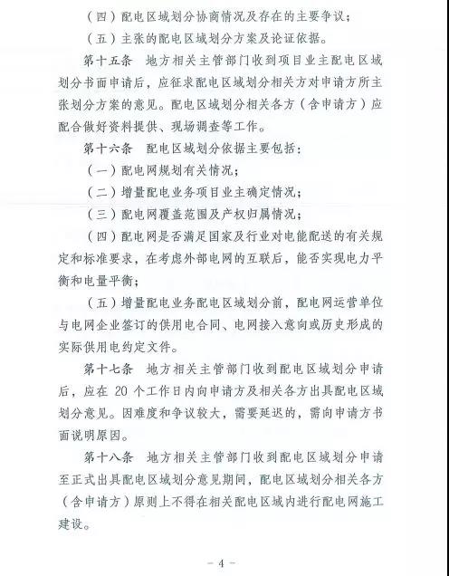 相比征求意見稿,辦法發(fā)生較大變化,按照“放管服”的要求,更加強(qiáng)化了地方政府在區(qū)域劃分與爭(zhēng)議協(xié)調(diào)工作的主體責(zé)任。辦法要求政府部門收到申請(qǐng)后20個(gè)工作日內(nèi)出具劃分意見,期間各方不得在區(qū)域內(nèi)進(jìn)行配電網(wǎng)施工建設(shè)。