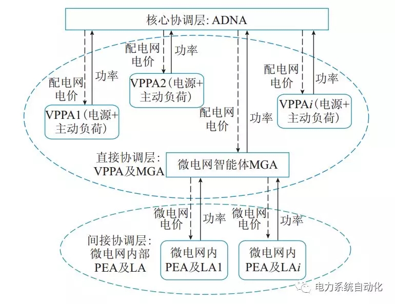 在此背景下,主動配電網(wǎng)多智能體系統(tǒng)包含核心協(xié)調(diào)層(ADNA)、直接協(xié)調(diào)層(VPPA與MGA)、間接協(xié)調(diào)層(微網(wǎng)內(nèi)PEAs、LAs),如圖2所示。處于上層的智能體對下層進(jìn)行電價激勵,處于下層的智能體對上層電價進(jìn)行功率響應(yīng),這一多層電價響應(yīng)機(jī)制保證了不同層級智能體間利益協(xié)調(diào)的有序進(jìn)行,原理類似于有序的多層規(guī)劃。