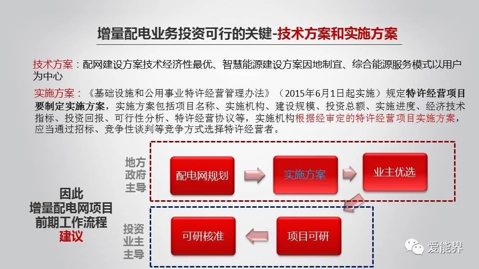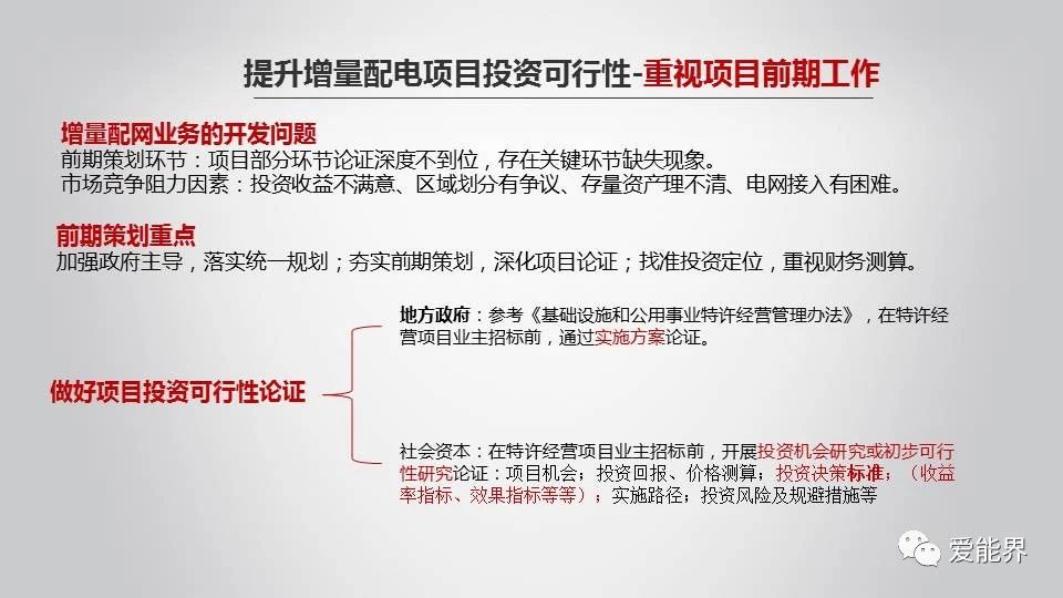 不同的市場主體,如政府、增量配電企業(yè)、綜合能源服務商、EPC投資方、運營商等,其參與增量配電業(yè)務的落腳點不同,作出決策所關(guān)注的點也不盡相同。另外,目前增量配網(wǎng)業(yè)務的開發(fā)不管是在前期策劃環(huán)節(jié)還是來自市場競爭阻力,都存在或多或少的問題。因此,重視增量配電項目前期工作,做好項目投資可行性論證,提升項目開發(fā)可行性顯得尤為重要。