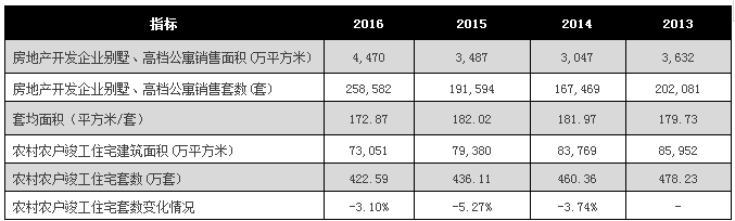 根據(jù)國(guó)家統(tǒng)計(jì)局公布的數(shù)據(jù),2016年全國(guó)別墅、高檔公寓銷售面積總量為4470萬(wàn)平方米,同年房地產(chǎn)開(kāi)發(fā)企業(yè)別墅、高檔公寓銷售套數(shù)總量為258582套,測(cè)算別墅、高檔公寓平均面積為172.87平方米/套。再根據(jù)國(guó)家統(tǒng)計(jì)局公布的農(nóng)村農(nóng)戶住宅竣工建筑面積數(shù)據(jù),2016年全國(guó)農(nóng)村農(nóng)戶竣工住宅建筑面積總量為73051.42萬(wàn)平方米,考慮到農(nóng)村農(nóng)戶住宅面積普遍較大,這里將農(nóng)村農(nóng)戶住宅的套均面積與別墅、高檔公寓套均面積近似處理,即172.87平方米/套。