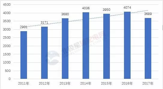 2011-2017年電力變壓器行業(yè)的銷售收入整體呈上漲態(tài)勢(shì),2016年電力變壓器行業(yè)實(shí)現(xiàn)銷售收入2726.75億元,同比增長12.24%,2017年電力變壓器行業(yè)實(shí)現(xiàn)銷售收入2693.55億元,同比下降1.22%。