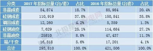 2017 年國家電網(wǎng)進(jìn)行了4次配網(wǎng)設(shè)備集中招標(biāo),根據(jù)其電子商務(wù)平臺(tái)公告信息統(tǒng)計(jì),2017 年招標(biāo)總量較 2016 年下降明顯。