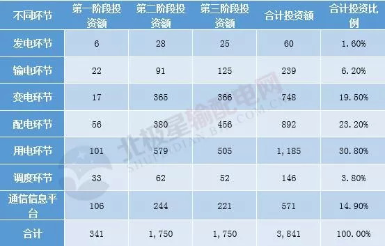 2009—2020年間,國家電網(wǎng)在智能電網(wǎng)方面的總投資約為3,841億元,其中第一階段的投資額為341億元,第二階段和第三階段的投資額均為1,750億元。每個(gè)階段內(nèi),智能電網(wǎng)各個(gè)環(huán)節(jié)的投資額如下表所示:?jiǎn)挝唬簝|元
