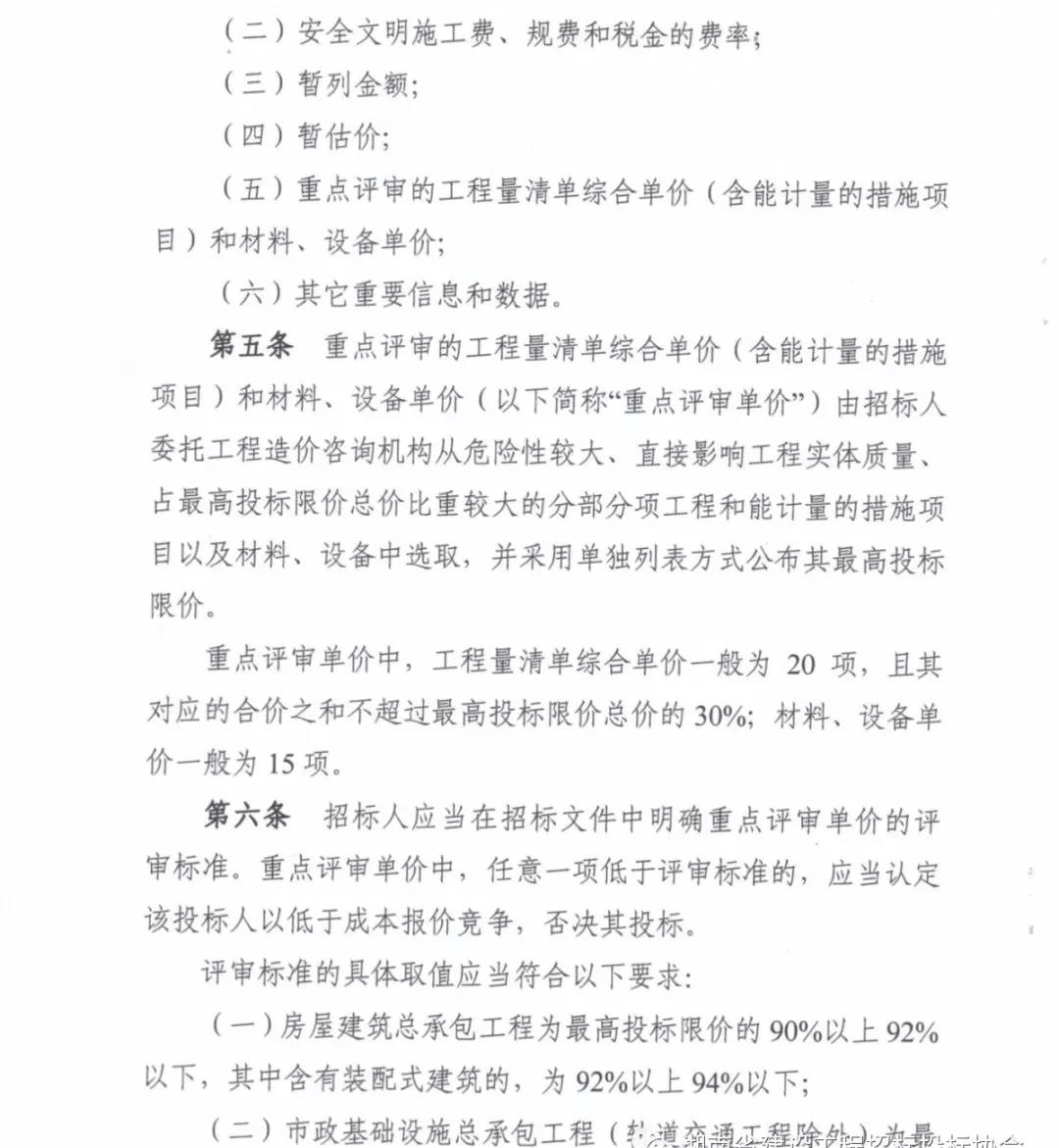 第五條 重點(diǎn)評審的工程量清單綜合單價(jià)(含能計(jì)量的措施項(xiàng)目)和材料、設(shè)備單價(jià)(以下簡稱“重點(diǎn)評審單價(jià)”)由招標(biāo)人委托工程造價(jià)咨詢機(jī)構(gòu)從危險(xiǎn)性較大、直接影響工程實(shí)體質(zhì)量、占最高投標(biāo)限價(jià)總價(jià)比重較大的分部分項(xiàng)工程和能計(jì)量的措施項(xiàng)目以及材料、設(shè)備中選取,并采用單獨(dú)列表方式公布其最高投標(biāo)限價(jià)。