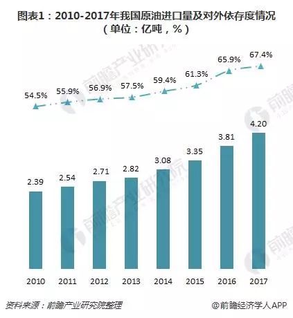 近年來,我國石油對外依存度屢創(chuàng)新高。國家統(tǒng)計局數(shù)據(jù)顯示,2017年全年我國原油進口量達到量4.2億噸,原油的對外依存度高達67.4%。未來,我國經(jīng)濟依然有望繼續(xù)保持較快增長勢頭,對石油的需求依然會不斷增加,石油對外依存度仍將繼續(xù)上升。