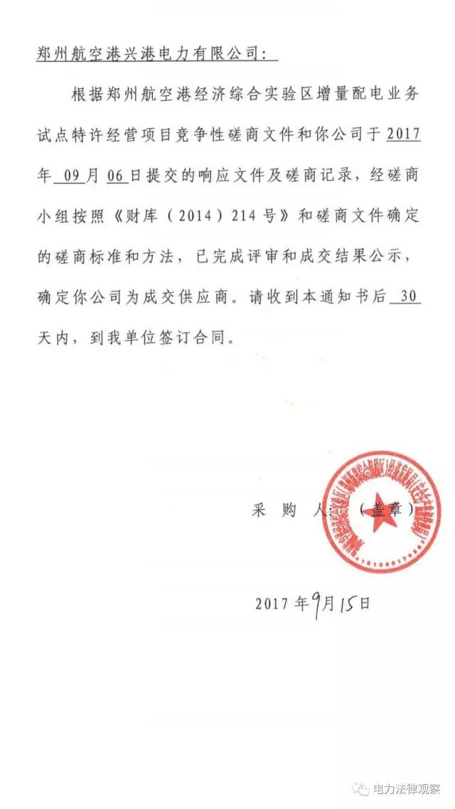 祝 賀鄭州航空港增量配電試點(diǎn)項(xiàng)目業(yè)主正式確定!鄭州航空港興港電力有限公司成功中選!該項(xiàng)目將采用特許經(jīng)營(yíng)模式,經(jīng)營(yíng)期限30年,期滿(mǎn)移交政府。興港電力的股權(quán)結(jié)構(gòu):鄭州航空港區(qū)國(guó)有資產(chǎn)經(jīng)營(yíng)管理有限公司持股51