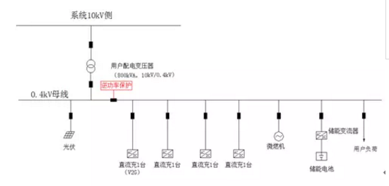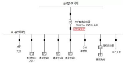 該微電網(wǎng)內平時用戶負荷小,由于設計初對充電樁使用率估計樂觀,實際投運初期,充電樁使用率低,導致整個微電網(wǎng)負荷小。為了避免向系統(tǒng)側倒送電量,逆功率保護動作微電網(wǎng)調整原運行方式。