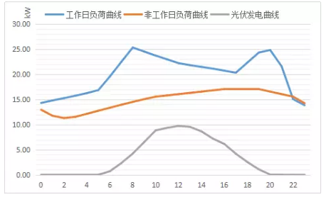 根據(jù)上面兩圖,標(biāo)準(zhǔn)月工作日最低負(fù)荷13.83kW,最高負(fù)荷25.31kW,全天用電量481.03kWh;非工作日最低負(fù)荷11.28kW,最高負(fù)荷17.04kW,全天用電量356.63kWh。白天(9:00~15:00)最低負(fù)荷15.04kW,最高負(fù)荷24.51kW。定義標(biāo)準(zhǔn)月有工作日21天,非工作日10天,計(jì)算標(biāo)準(zhǔn)月用電量為13668kWh。